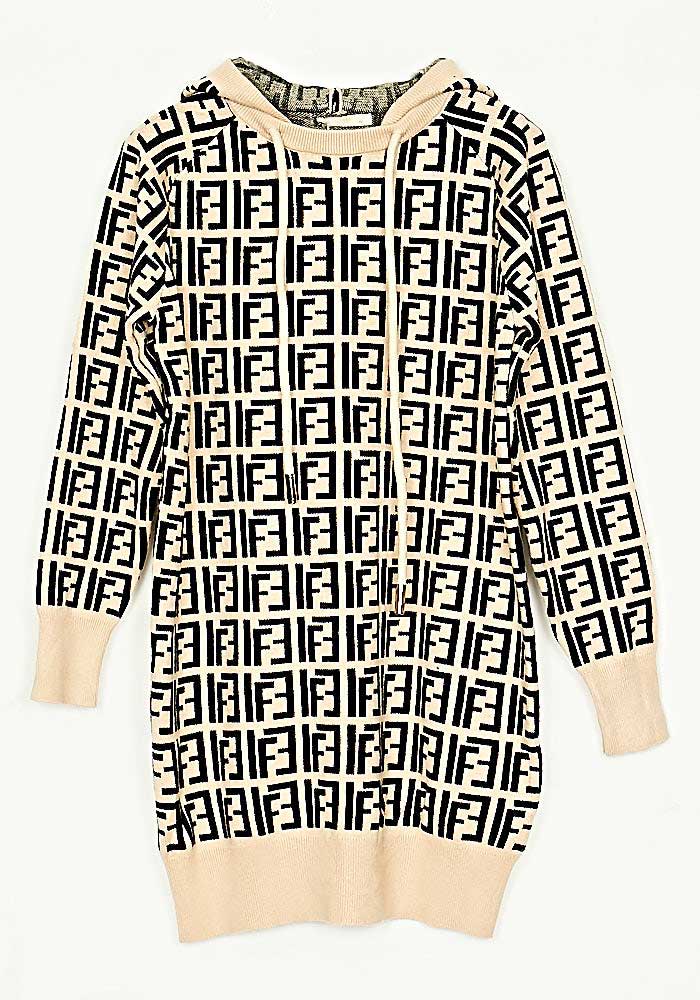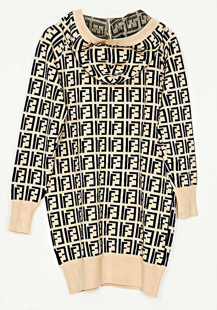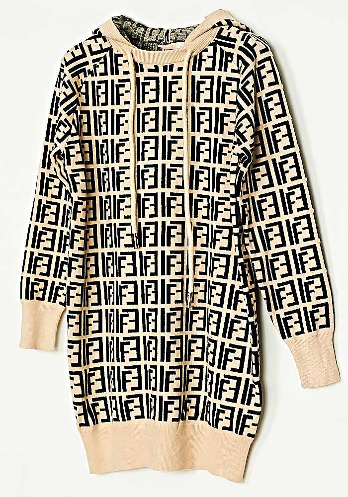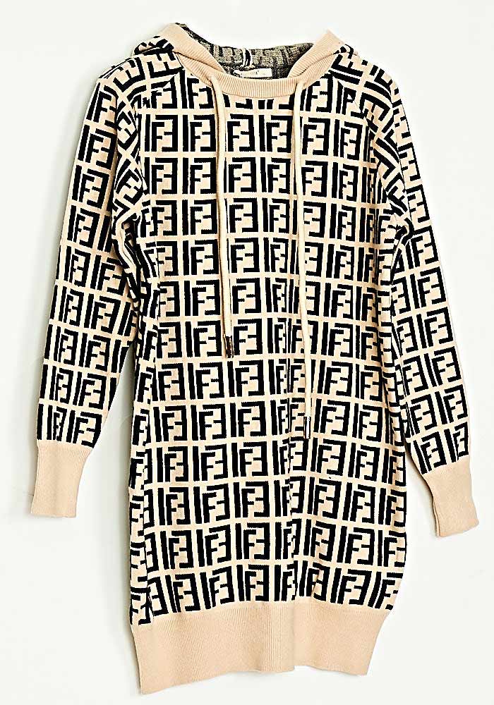 Φόρεμα/Μπλούζα Hoodie Πλεκτό Loose Fit Mπεζ/Μάυρο