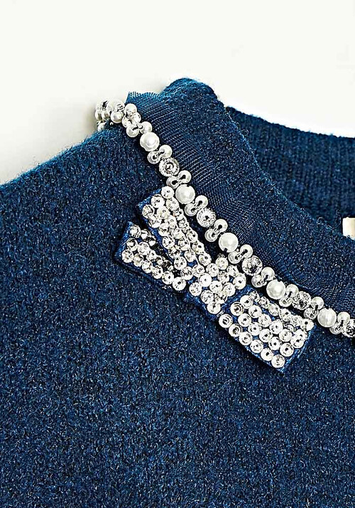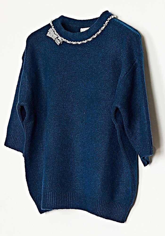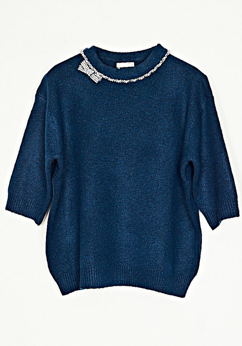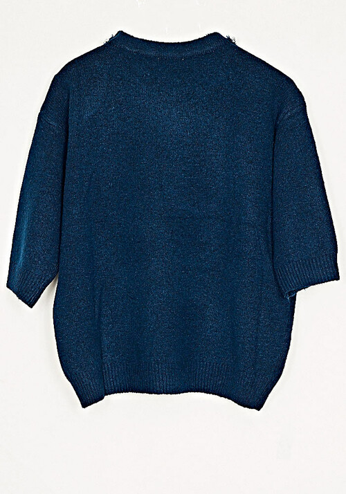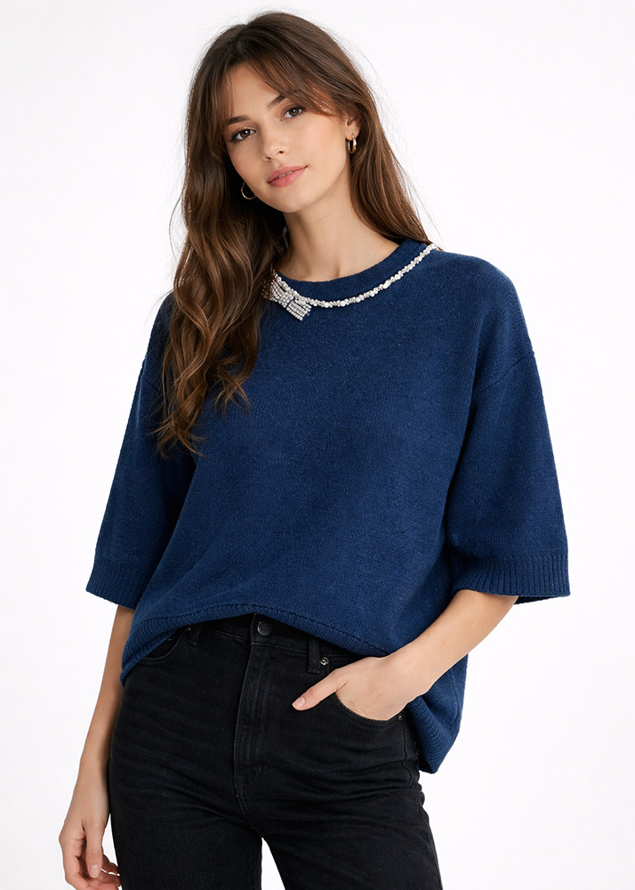 • Μπλούζα Πλεκτή Κοντομάνικη Strass  Περλίτσα Λεπτομέρεια Μπλε