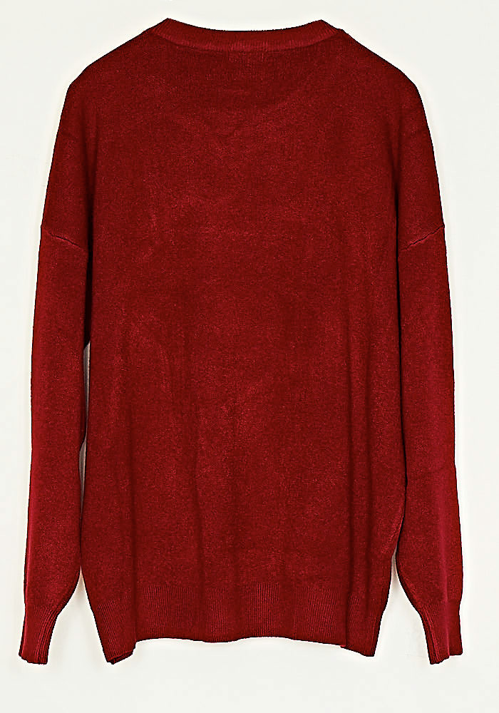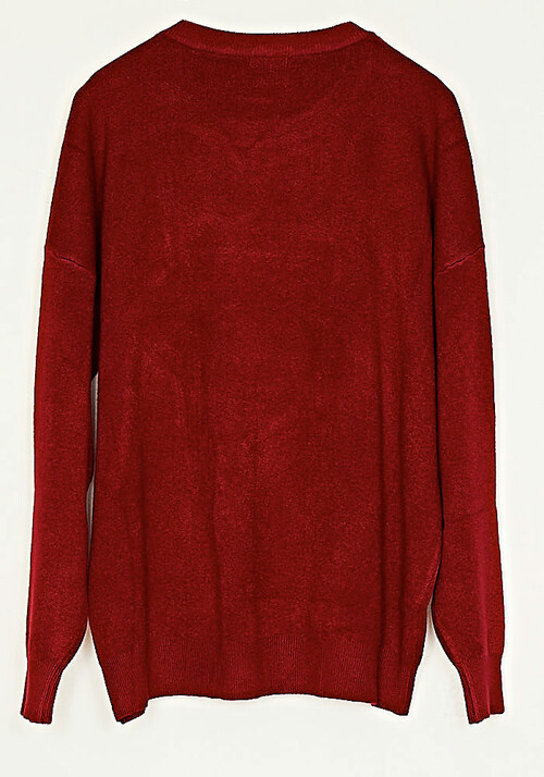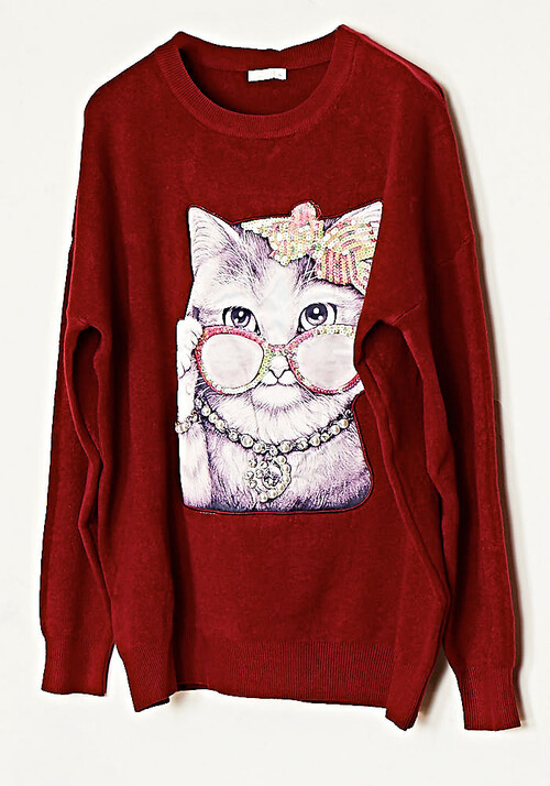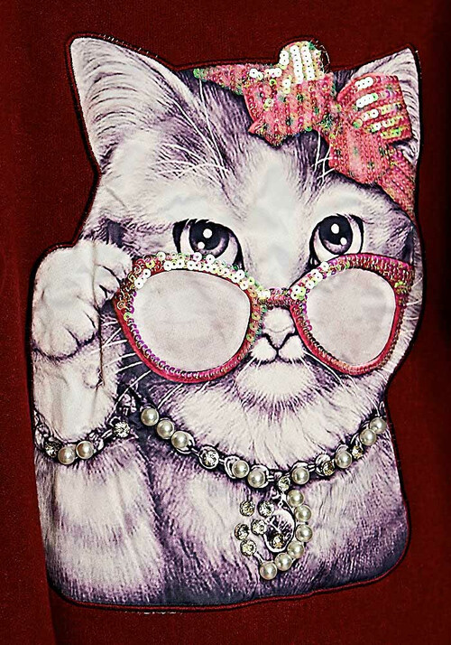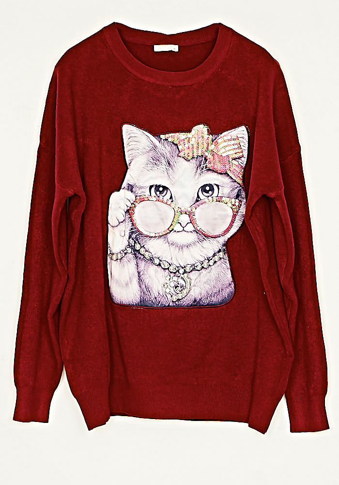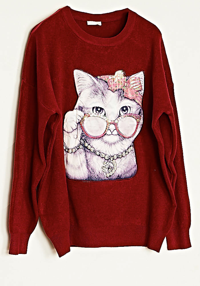 • Pullover "Lovely Cat" Loose Fit  Με Strass & Πέρλες Μπορντώ