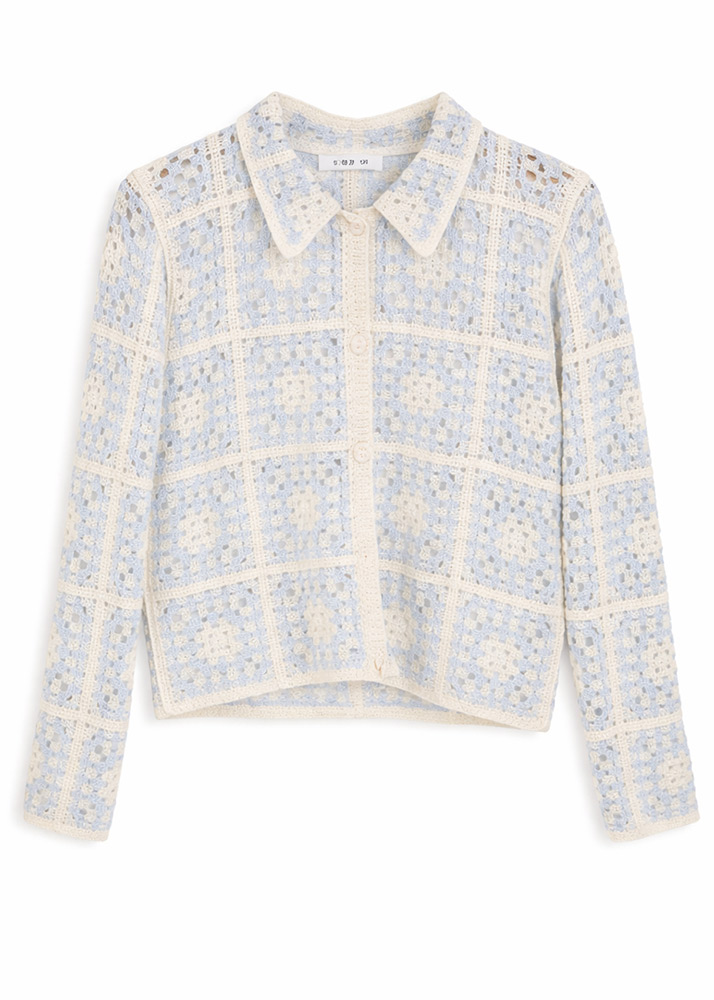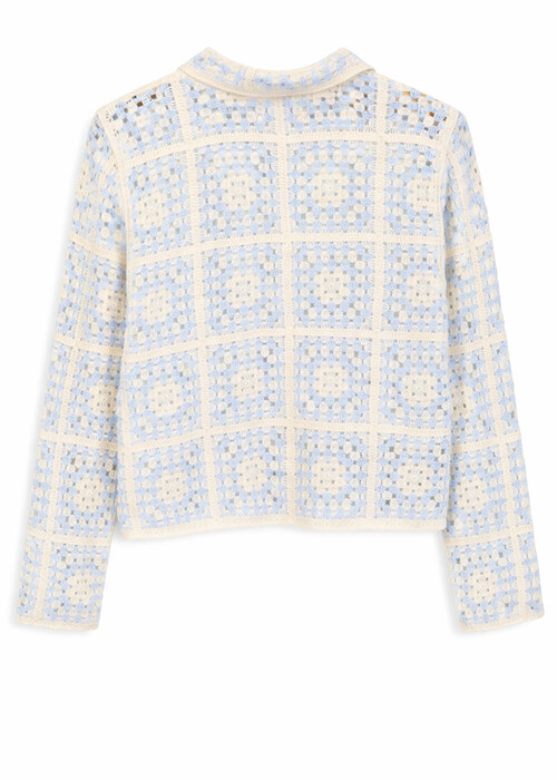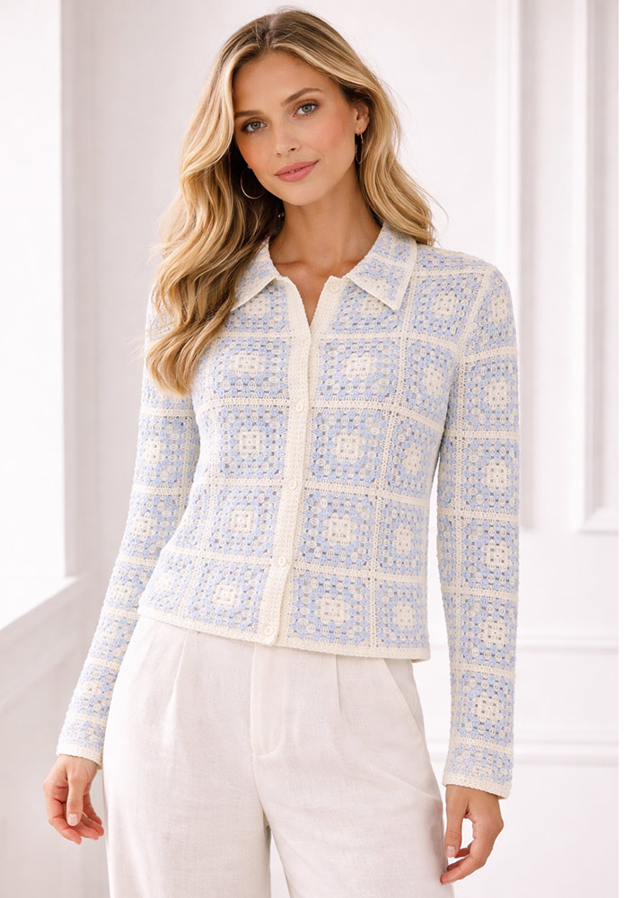 Ζακετάκι Crochet Mακριά Μανίκια & Γιακαδάκια Εκρού/Γαλάζιο