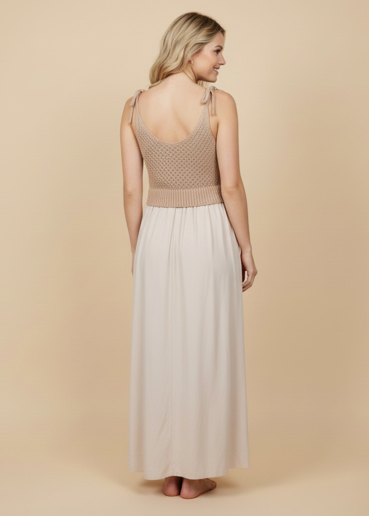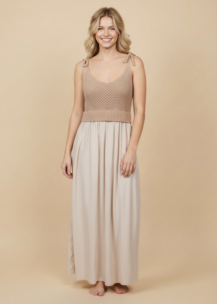 Φόρεμα Maxi Βαμβακερό Συνδυασμός Υλικών Μπεζ
