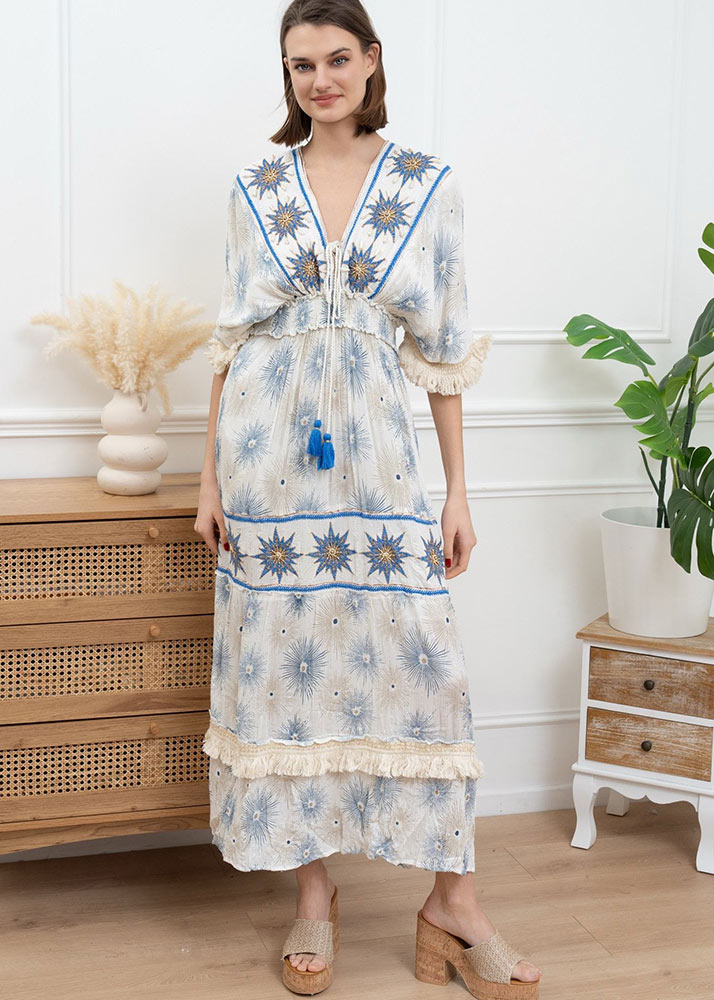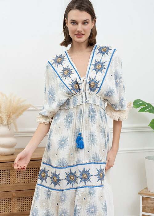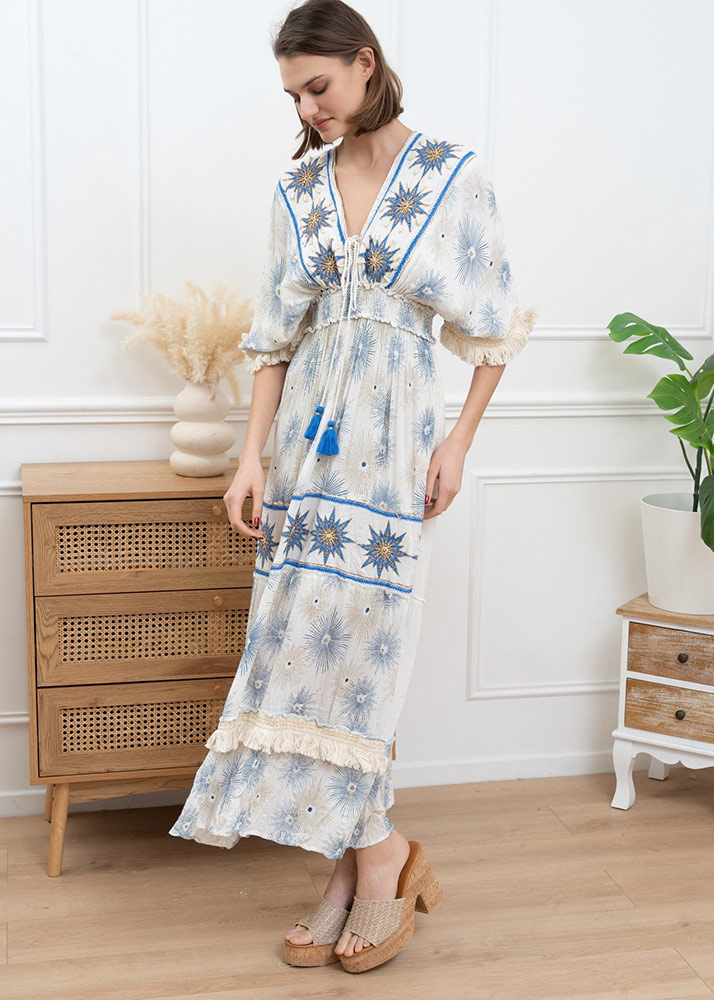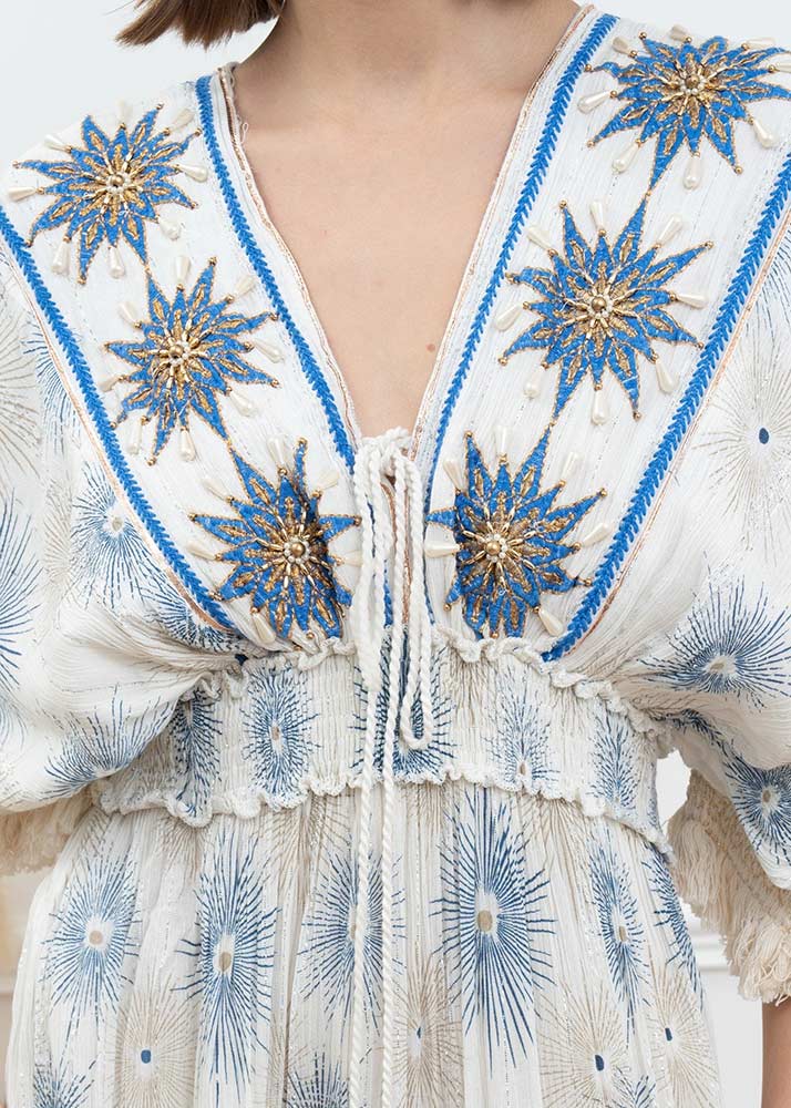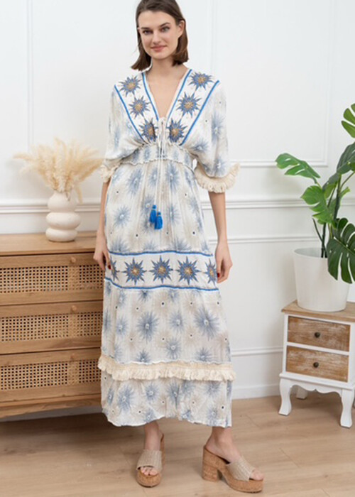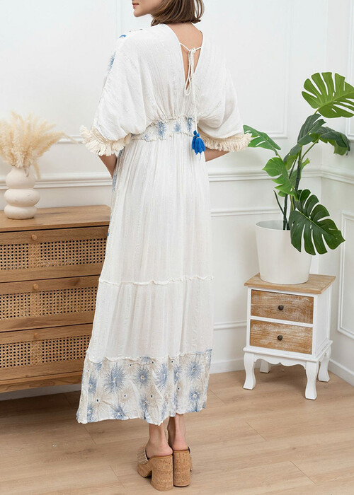 Φόρεμα Maxi Γάζα Χειροποίητο Κέντημα Ιβουάρ Μπλε Ρουά