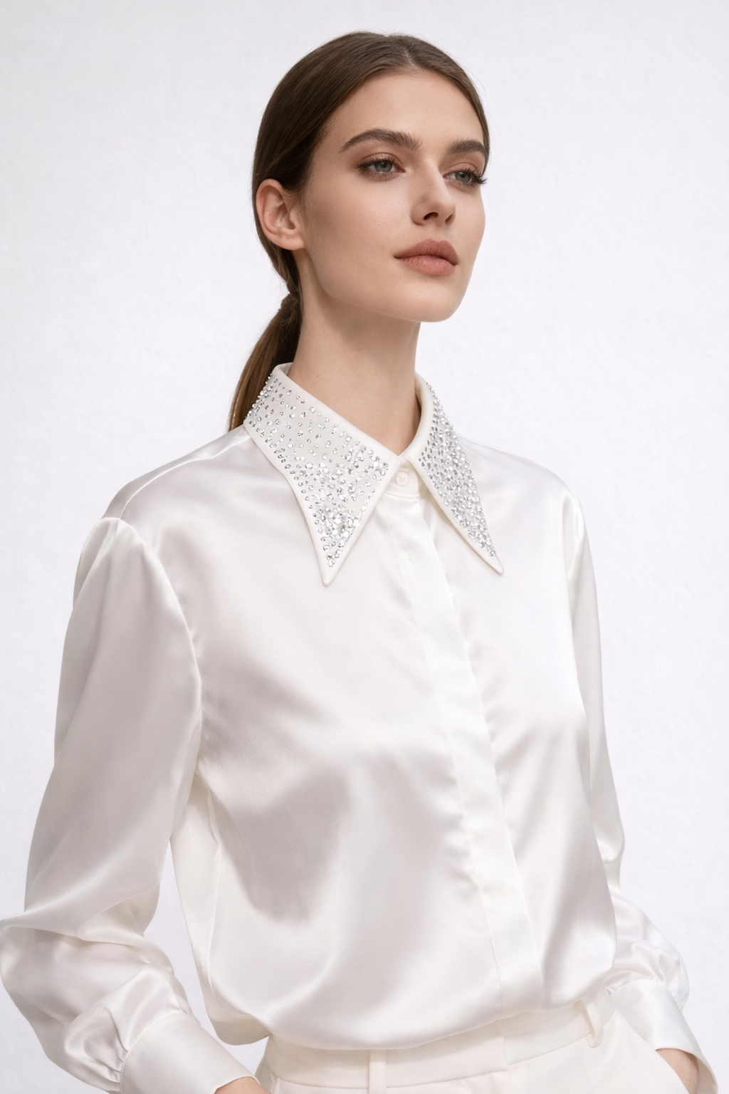• Πουκάμισο Light Satin Mε Strass Στους Γιακάδες Λευκό
